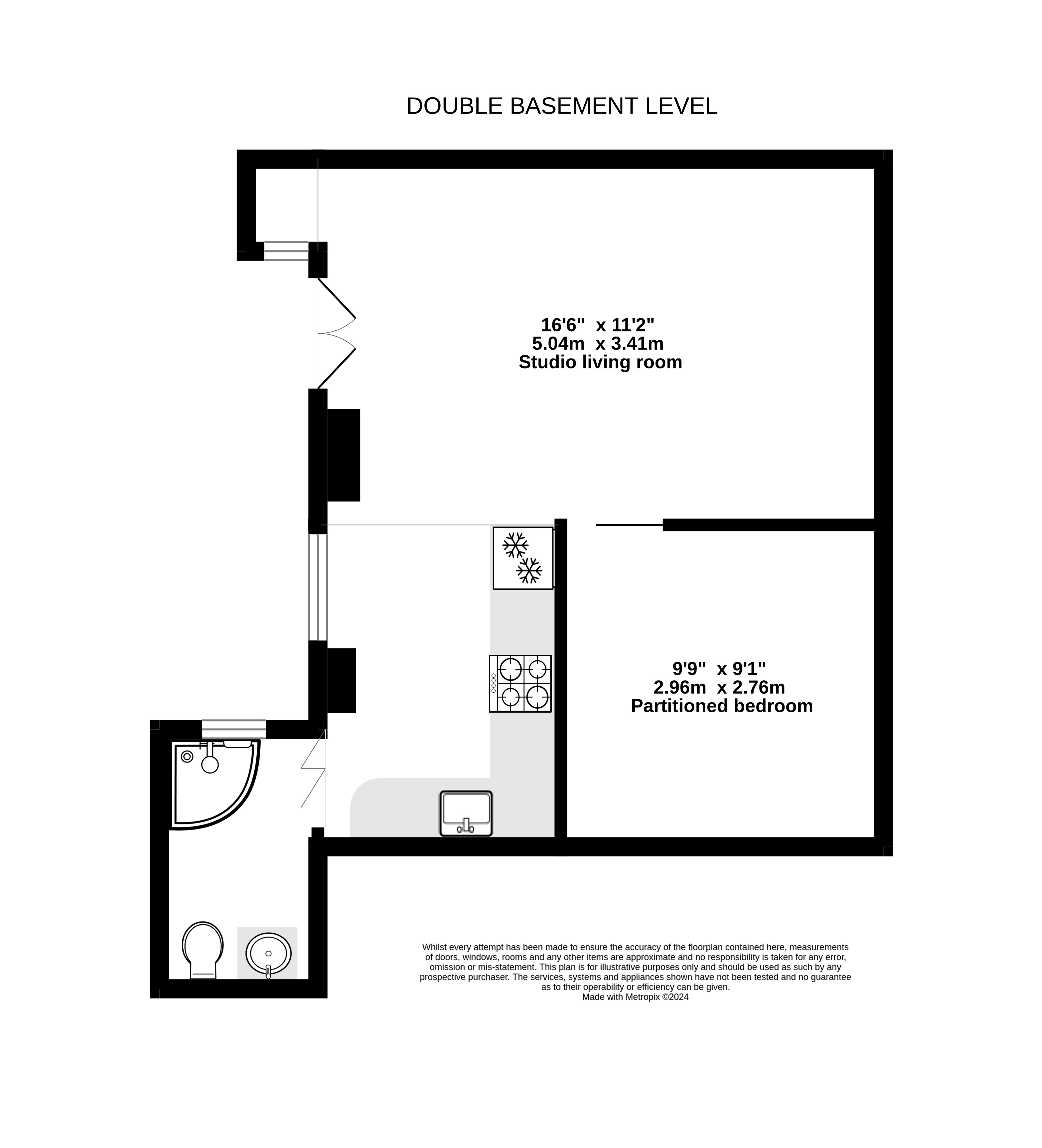 Double basement: studio living room, partitioned bedroom, shower room, kitchen area, storage alcove