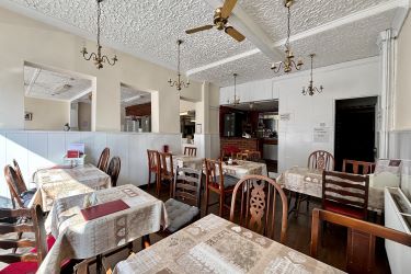Ground floor: open plan commercial space, commercial kitchen, multiple storage rooms